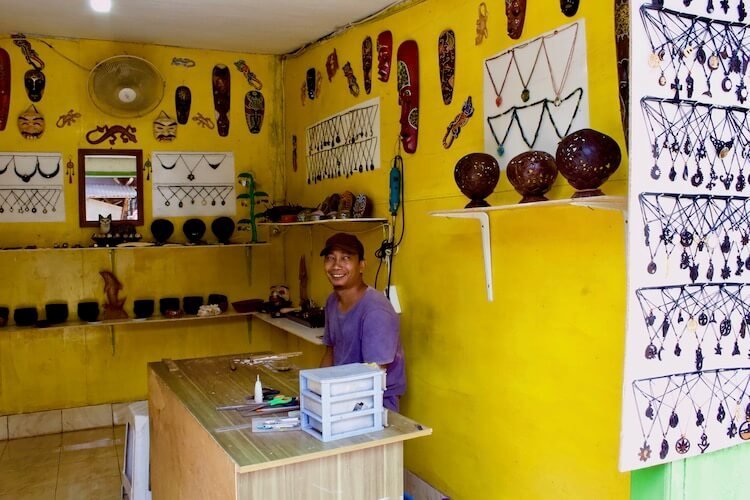 Ein Geheimtipp ist außerdem das kleine Schmuckgeschäft von Franky (siehe Foto). Alles was es in Franky’s Laden zu kaufen gibt, ist von ihm handgefertigt. Die meisten Armbänder, Halsketten und Ohrringe bestehen aus Muscheln, Edelsteinen und der Schale von Kokosnüssen. Wenn du etwas ganz Besonderes aus Gili Air mit nach Hause nehmen willst, so kannst du dir von Franky auch ein Schmuckstück nach deinen Vorstellungen individuell anfertigen lassen.